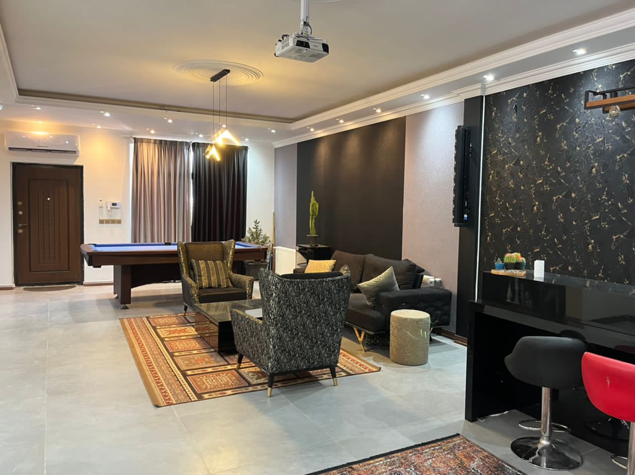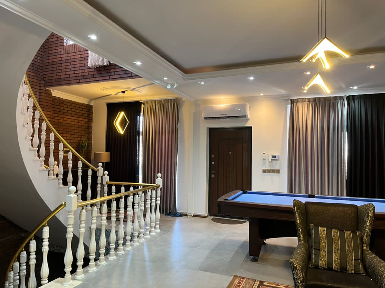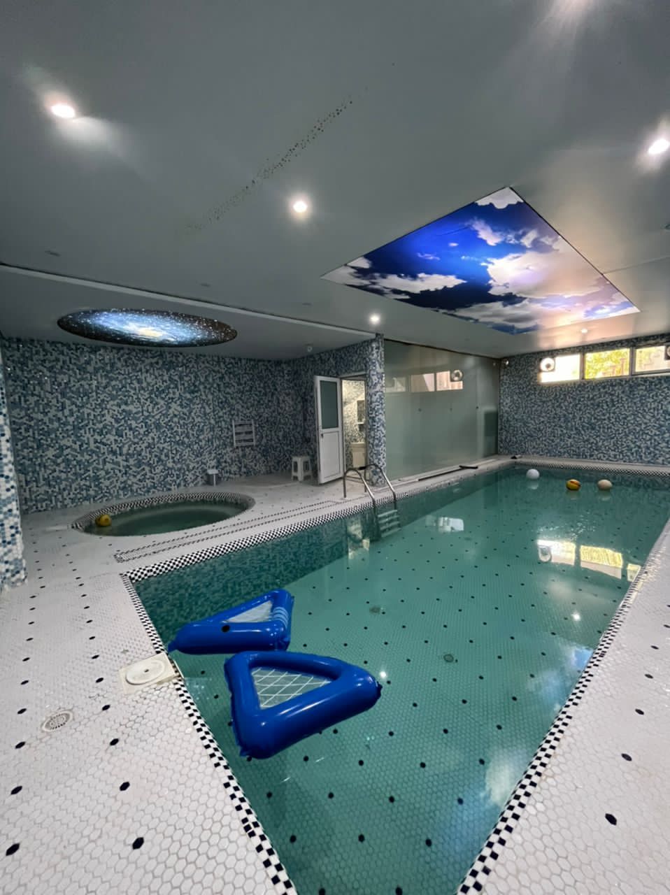 دوبلکس، سه خوابه، یک خوب مستر، استخرسرپوشیده، جکوزی، باربیکیو، آتشکده، ویدیو پروژکتور